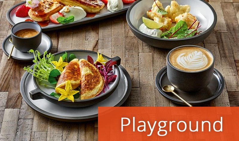 Playground: Für Gastronomen, die Akzente setzen wollen, bietet Playground eine Spielwiese aus außergewöhnlichen Materialien und trendigen Designs, die perfekt mit klassischem Hotelporzellan kombiniert werden können.